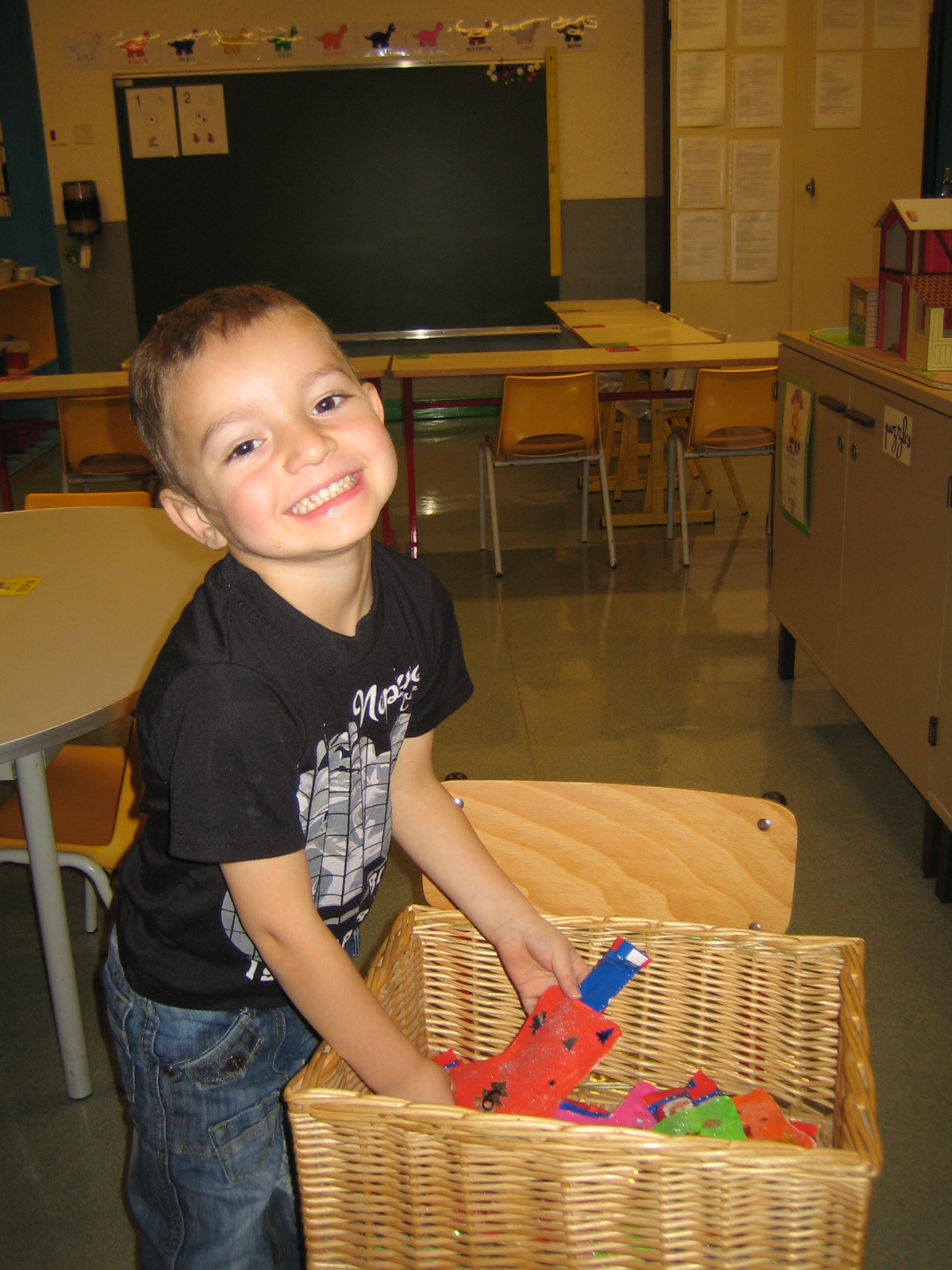On prend la chaussette avec le bon chiffre et on retire la sucette en chocolat qui est dedans. On la met sur le bureau de la maîtresse.Ensuite on accroche la chaussette sur la bonne pince à linge.